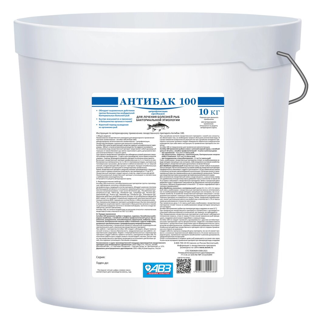 Антибак 100 назначают рыбам с лечебно-профилактической целью при аэромонозе, псевдомонозе, бактериальном бранхионекрозе, флексибактериозе, коринобактериозе, плавниковой гнили, цитробактериозе, фурункулезе, вибриозе, микобактериозе, стрептококкозе, а также при болезнях, осложненных бактериальной инфекцией.