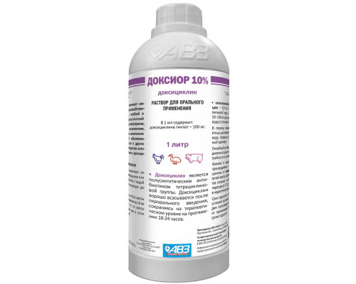 ДОКСИОР® 10% назначают свиньям и сельскохозяйственной птице с лечебной и лечебно-профилактической целью при колибактериозе, пастереллезе, сальмонеллезе, стафилококкозе, хронических респираторных заболеваниях, микоплазмозе и других инфекциях, возбудители которых чувствительны к доксициклину.