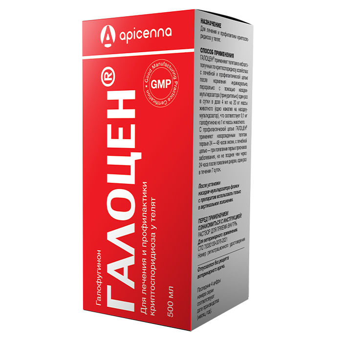 Для достижения максимального профилактического эффекта, снижения количества ооцист, выделяемых во внешнюю среду и предотвращения распространения криптоспоридиоза Галоцен следует применять всем телятам в хозяйстве одновременно.