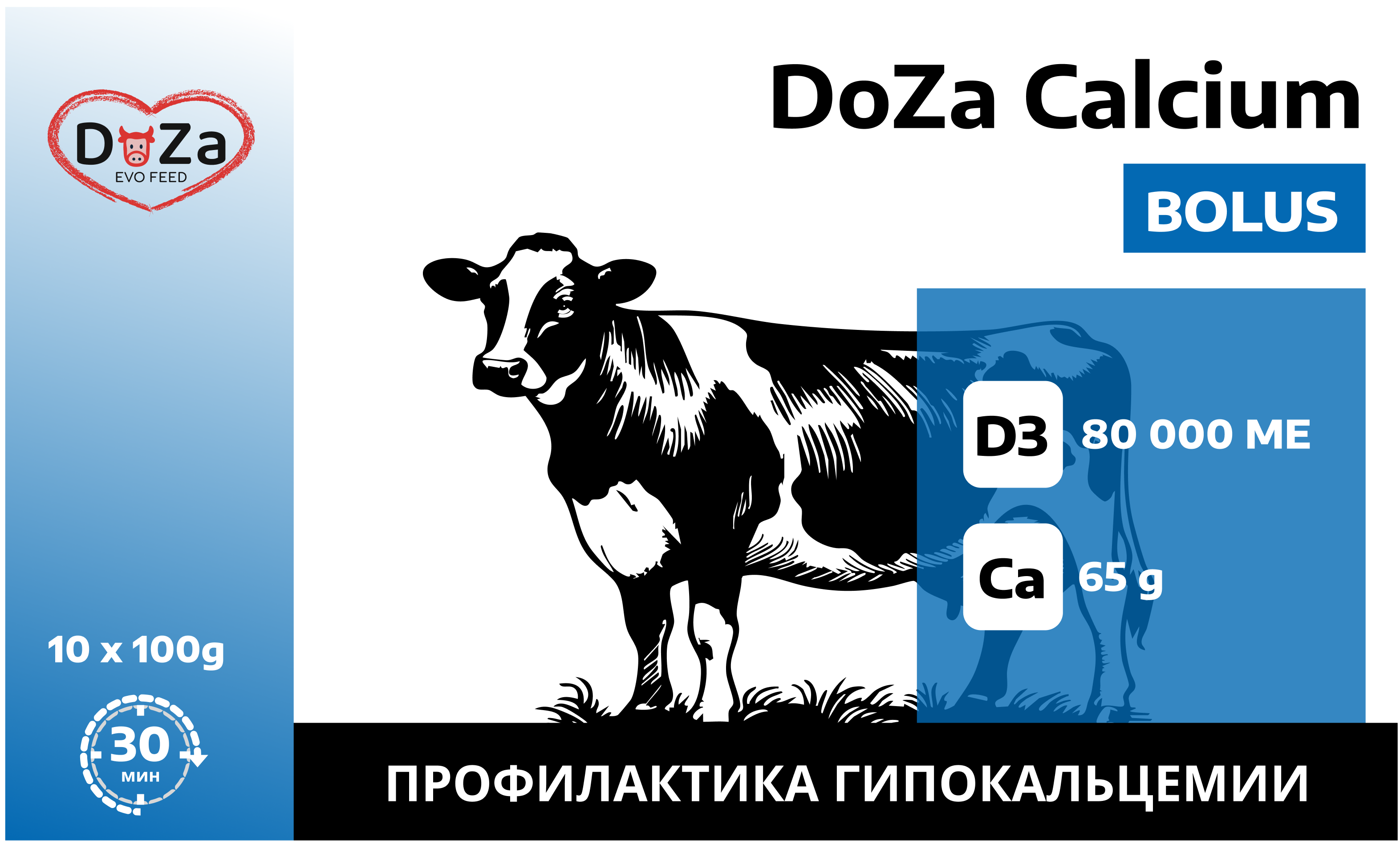 «Доза Кальций» — это 65 грамм Кальция в одном болюсе и 80000 МЕ витамина D3. высокоэффективная кормовая добавка в форме болюса, разработанная для быстрого и безопасного восполнения дефицита кальция у коров в критические периоды — непосредственно после отёла и в первые сутки лактации. Препарат содержит комплекс легкоусвояемых солей кальция и витамин D3, что обеспечивает как мгновенное, так и пролонгированное поступление кальция в организм животного. Добавка способствует нормализации кальциево-фосфорного обмена, поддерживает здоровье костной и мышечной систем, снижает риск послеродовых осложнений, связанных с гипокальциемией.
