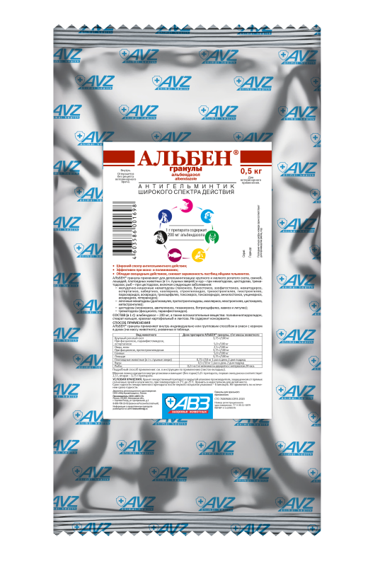 АЛЬБЕН® гранулы применяют для дегельминтизации крупного и мелкого рогатого скота, свиней, лошадей, плотоядных животных (в т.ч. пушных зверей) и кур при нематодозах, цестодозах, трематодозах; рыб - при цестодозах, включая следующие заболевания: