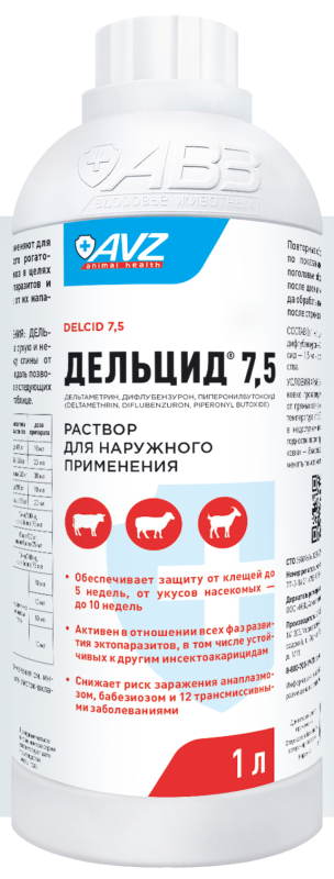 Дельцид 7,5 применяют для обработки крупного рогатого скота, овец и коз в целях уничтожения эктопаразитов и защиты животных от их нападения.