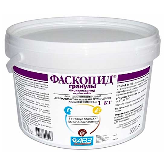 Фаскоцид - гранулы для дегельминтизации жвачных животных при трематодозах. По внешнему виду препарат представляет собой плоские круглой формы таблетки с риской с одной стороны, от кремового до серого цвета или гранулы от кремового до серого цвета, трудно растворимые в воде.