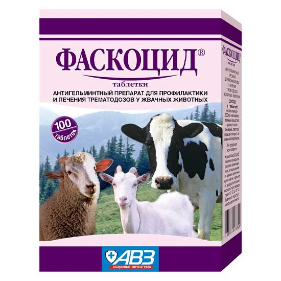 Фаскоцид - таблетки для дегельминтизации жвачных животных при трематодозах. По внешнему виду препарат представляет собой плоские круглой формы таблетки с риской с одной стороны, от кремового до серого цвета или гранулы от кремового до серого цвета, трудно растворимые в воде.