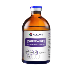 Действующее вещество (подробно) Толфемакс 4%, 8% в 1 мл в качестве действующего вещества содержит толфенамовую кислоту - 40 мг или 80 мг и вспомогательные вещества: бензиловый спирт - 10 мг, моноэтаноламин, диэтиленгликоль моноэтиловый эфир, вода для инъекций - до 1 мл.