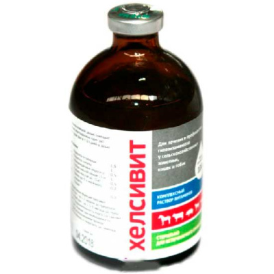 Хелсивит» в 1 мл в качестве действующих веществ содержит: витамин А (ретинол) 1 О ООО МЕ, витамин DЗ (кальциферол) - 2 ООО МЕ, витамин Е (токоферол) - 1 О мг, витамин К (викасол) - 1 мг, витамин В 1 (тиамин) - 0,7 мг, витамин В2 (рибофлавин) - 1,13 мг, витамин В6 (пиридоксин) - 1,1 мг, витамин В12 (цианокобаламин)- l,2 мкг, витамин РР (никотинамид)-9,2 мг, витамин В5 (пантотенат кальция) - 3,45 мг, витамин В9 (фолиевая кислота) - 0,08 мг, витамин Н (биотин) - 13,8 мкг, витамин В4 (холин) - 10 мкг, витамин В8 (инозит) - 10 мкг, глюкоза - 50 мг, а также вспомогательные компоненты: полипропиленгликоль - 30 мг, твин 80 - 50 мг, трилон Б - 0,2 мг.